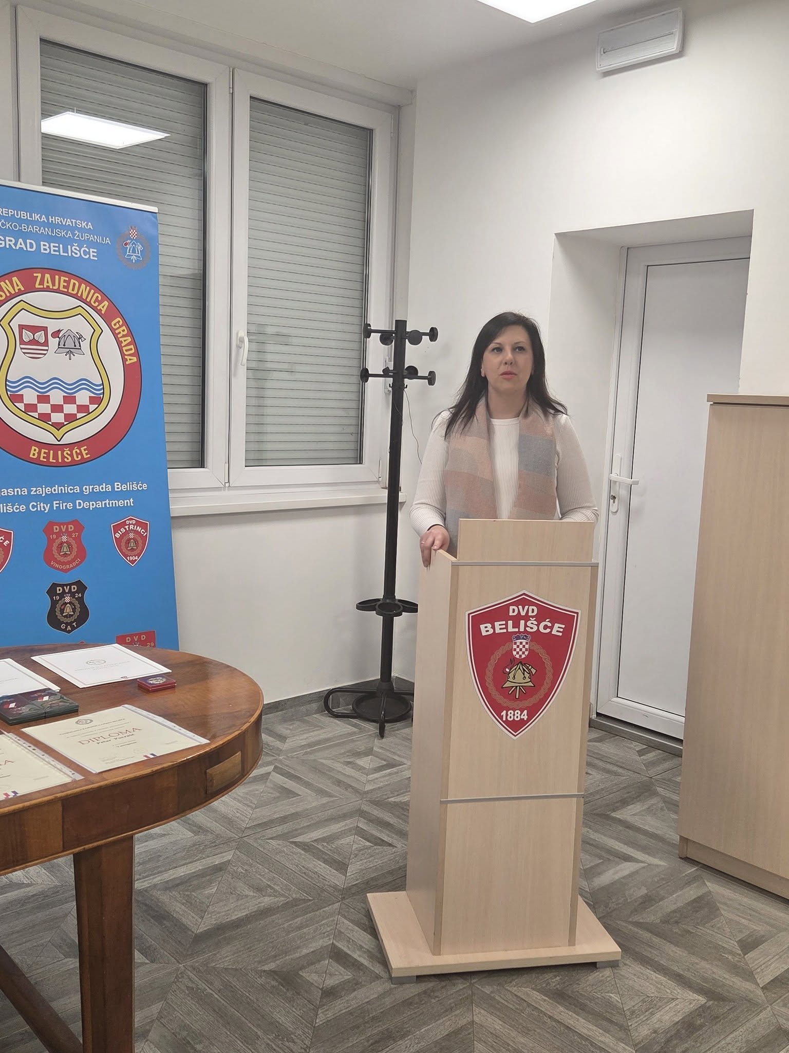Gđa Ivana Jerbić, gradonačelnica grada Belišća, pozdravila je sve prisutne te izrazila zadovoljstvo što se nalazi u ovoj prostoriji sa svima prisutnima. Čestita na plemenitosti, požrtvovnosti i na volonterskom radu za zajednicu. Također se zahvaljuje zapovjedniku g. Dubravku Čovčiću na svom trudu i energiji koju je uložio u rad DVD-a Belišće, a novom zapovjedniku čestita i razumije početnu nervozu i tremu. Raduje se budućoj suradnji, grad Belišće pod njezinim vodstvom stoji na raspolaganju novim, mladim idejama te izražava punu podršku u radu novom vodstvu.