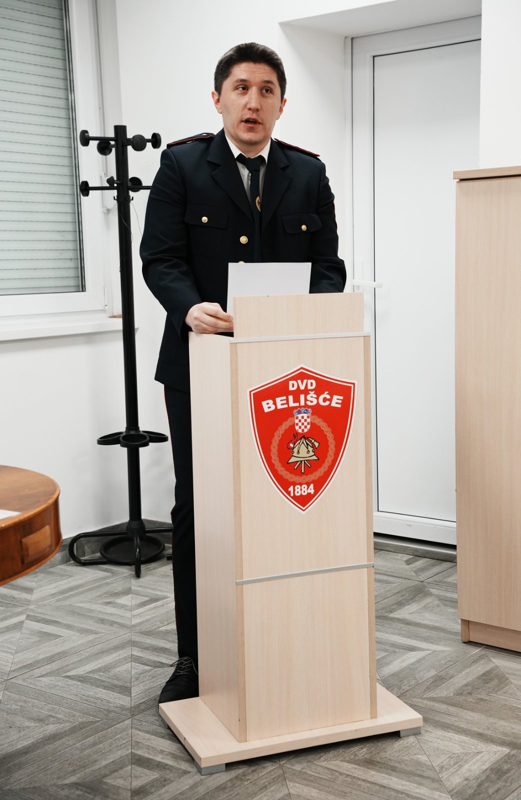 Od gostiju prisutnima se prvi obratio predsjednik Vatrogasne zajednice grada Belišća g. Nikica Mužević. Čestita novom zapovjedniku na izboru i želi puno sreće u radu. Također pozdravlja sve prisutne goste i zahvaljuje se svima na dolasku. Smatra kako je najvažnija poruka koju može uputiti članovima Društva za budućnost da nije dovoljno biti samo dobar vatrogasac u gašenju požara, nego također i da trebaju biti dobri ljudi.