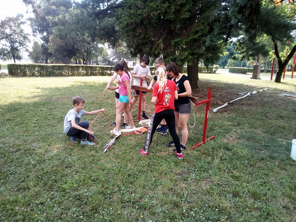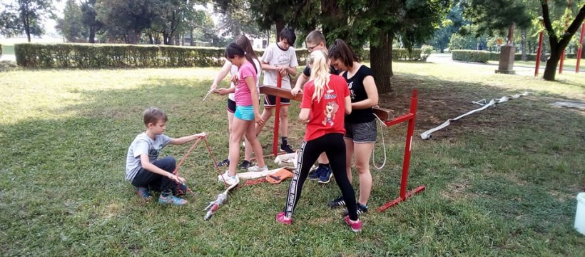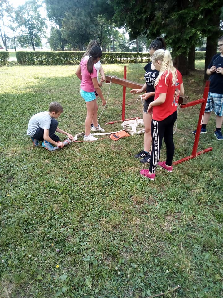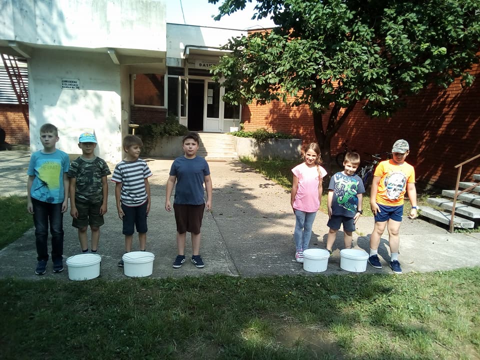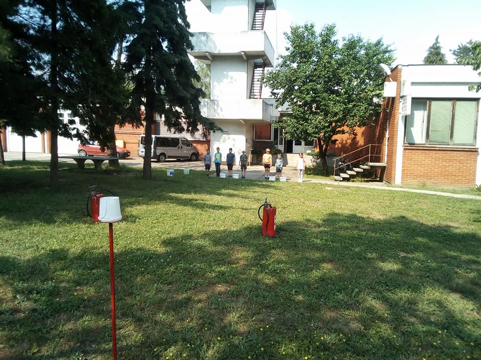 Mali dio vježbe sa vatrogasnim aparatom za početno gašenje požara vodom. Članovi pomlatka djeca od 6 do 12 godina.
