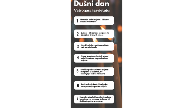 Dok se prisjećamo najmilijih koji nisu više s nama, budimo na oprezu zbog mogućeg nastanka požara svijeća, voska i suhog cvijeća.