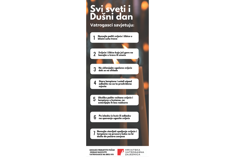 I ove će godine velik broj hrvatskih građana obilježiti blagdan Svih svetih i Dušni dan tradicionalnim odlaskom na groblje, postavljanjem cvijeća na grobove i paljenjem svijeća. Na taj način se sjećamo naših najmilijih koji više nisu s nama. U ovakvim trenucima potrebno je pozvati građane na oprez zbog mogućeg nastanka požara jer se velika količina upaljenih svijeća, rastopljenog voska i suhog cvijeća na grobljima može lako zapaliti.