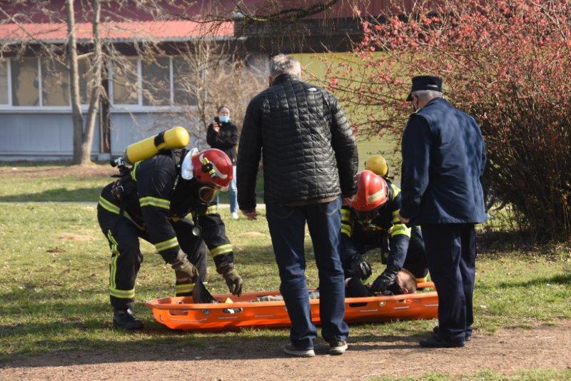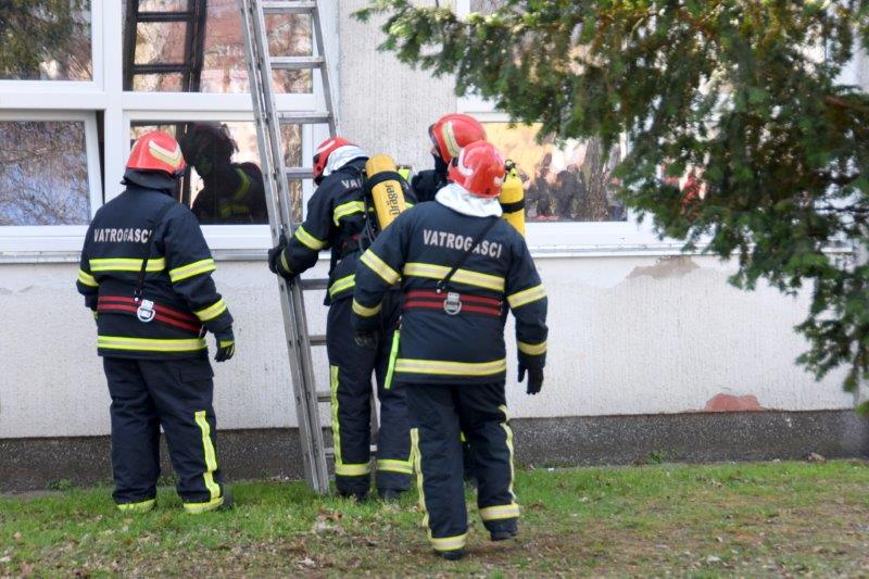 Zapovjednik DVD Belišća izdaje zapovijed spašavanja osobe – učenika, gdje jedna vatrogasna grupa sa izolacijskim aparatima ulazi na glavni ulaz u objekt škole, a druga vatrogasna grupa preko ljestava provjerava na višim katovima objekta škole.